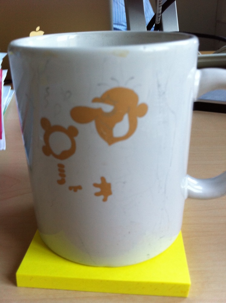 Ausgegraben: Man erkennt noch einen Mann mit lichtem Haar und senilem Gesichtsausdruck, der ein schreiendes Baby auf dem Arm h??lt; Titel wahrscheinlich: „F??r den besten Papa der Welt“ oder so ??hnlich.