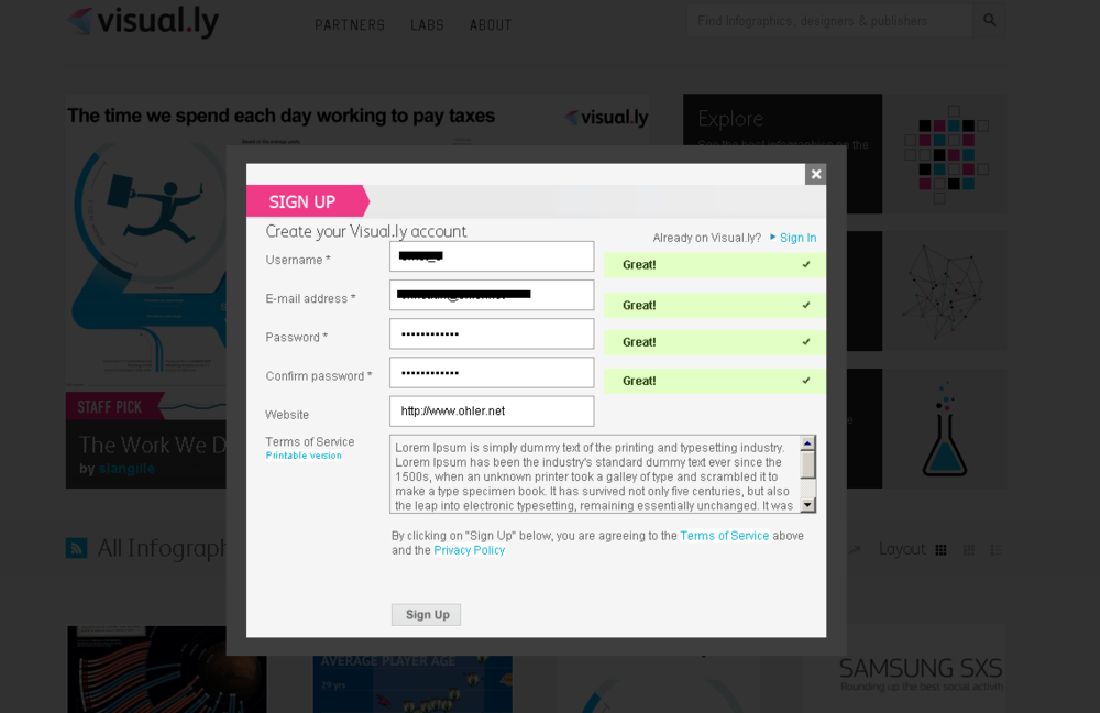Bei http://visual.ly/ macht man sich schon gar keine Mühe mehr, Geschäftsbedingungen zu formulieren, die dann eh‘ wieder keiner liest.